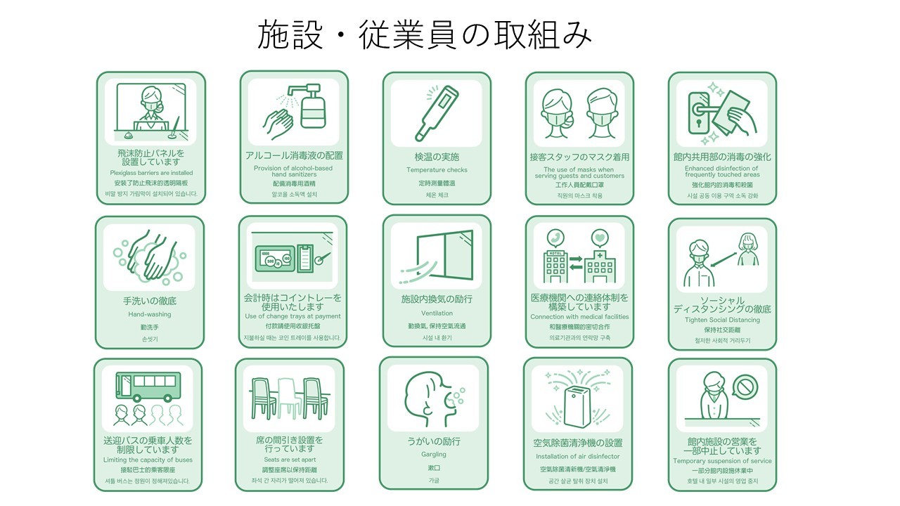 「福島県旅館・ホテル等宿泊施設等における新型コロナウイルス感染症対応に関するガイドライン」を踏まえ、 当館では下記の感染防止対策を行っております。 お客様には何卒ご理解とご協力を賜りますようお願い申し上げます。下記対策を行っております。 宿における新型コロナウイルス感染予防対策はこちら