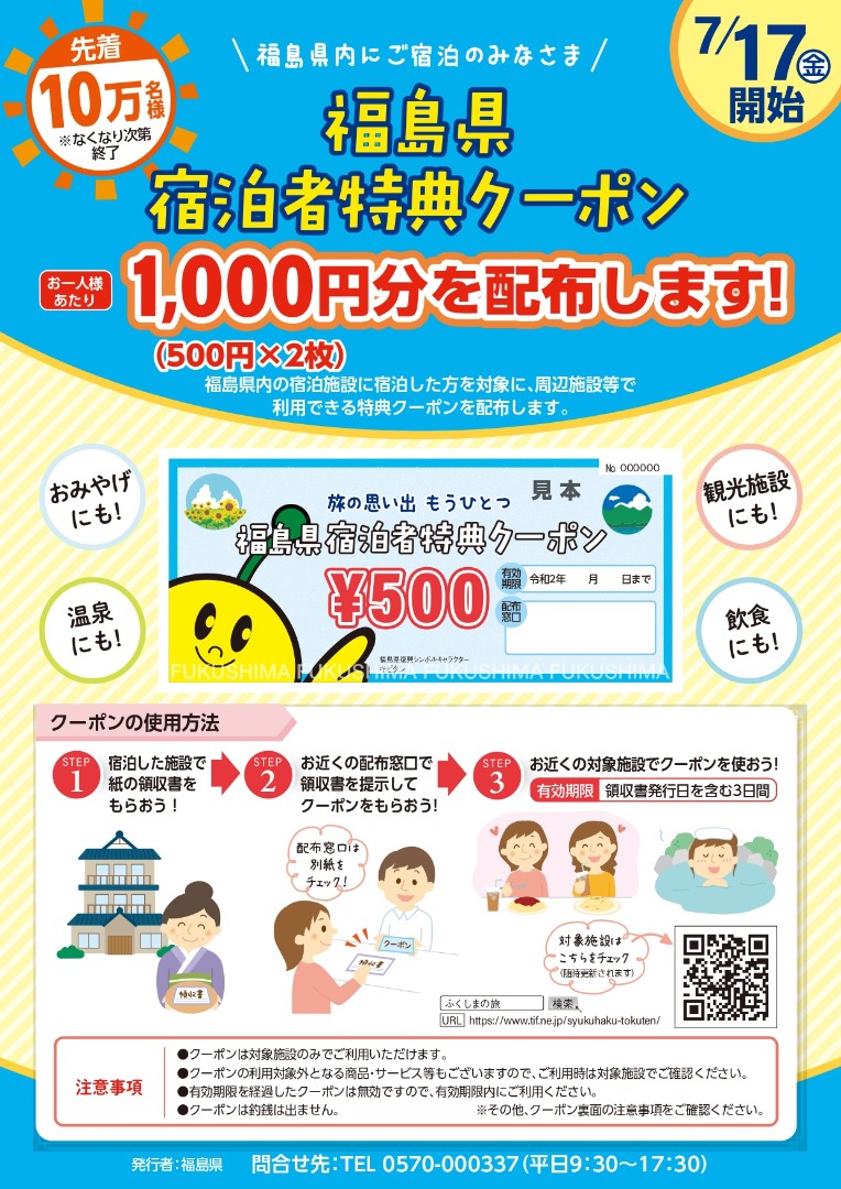 ただいま福島県では、県内の宿泊施設に宿泊した方を対象として特典クーポンを7月17日(金曜日)より配布しておりますのでお知らせします。 各観光案内所に宿泊領収書を提示すると、どなたでも1000円クーポンがもらえます。 熱塩温泉山形屋へお泊り頂いたお客様も対象になりますので、この機会にぜひご利用ください。 名称 福島県宿泊者特典クーポン 配布対象者 県内の宿泊施設に宿泊した方(宿泊領収書により確認) 配布内容 宿泊1名当たり 1,000円(500円券×2枚) 配布期間 7月17日(金曜日)~9月30日(水曜日) ※無くなり次第終了 利用期間 宿泊領収書発行日を含む3日間 喜多方市の最寄りの観光案内所 ・喜多の郷観光案内所(道の駅喜多の郷) ※当館より車で7分 ・西四ツ谷観光案内所 ※当館より車で15分 お問合せ 電話 0570-000337(平日・土日祝とも 9時30分~17時30分)