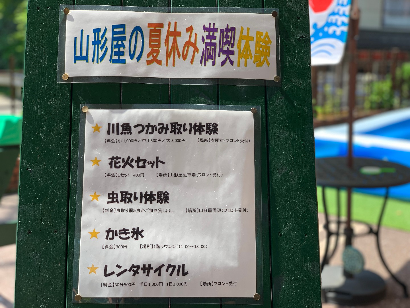 只今、山形屋では子供たちに田舎を感じて頂きたいという想いから山形屋夏休み満喫体験を行っております。 田舎だからこそできる体験や感動を親子一緒に感じてみませんか。 【プログラム】 ・川魚つかみ取り体験 ・田舎で花火体験 ・虫取り体験 ・レトロカキ氷 ・田舎でサイクリング 今年の夏休みは山形屋で過ごしてみてはいかがでしょうか。