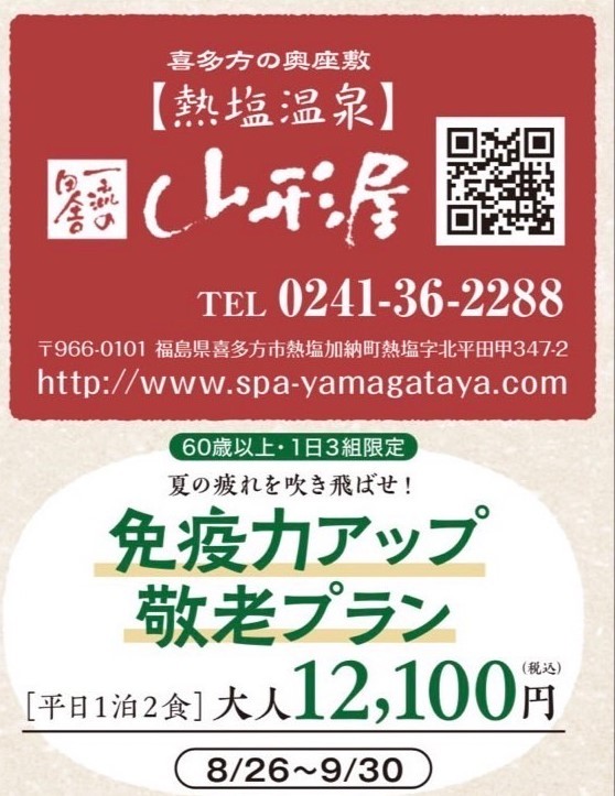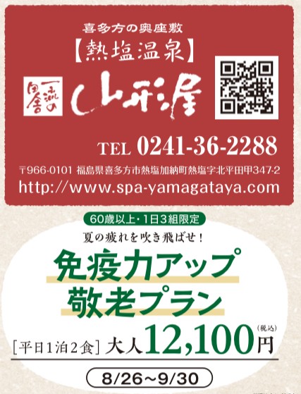 【まだまだ続く夏の疲れを吹き飛ばそう!敬老プラン ~~】 平日限定で60歳以上の方、1日3組限定の特別プランを販売中! 温泉と美味しい食事で夏の疲れを吹き飛ばそう^ ^)/ 60歳以上の方ならどなたでもOK! なんと、グループ内にお一人でも60歳以上の方がいれば 全員が特別料金でご宿泊いただけます!! 1日3組限定!早い者勝ち!! ご予約の際はお早めにお申し込みください! *************************************** 期日:9月30日~10月10日の平日限定 人数:2名様から申し込み可能 *************************************** ※こちらのプランは現金精算のみとなっております。 ●敬老プランへのご予約はこちらからクリックしてご予約可能!●
