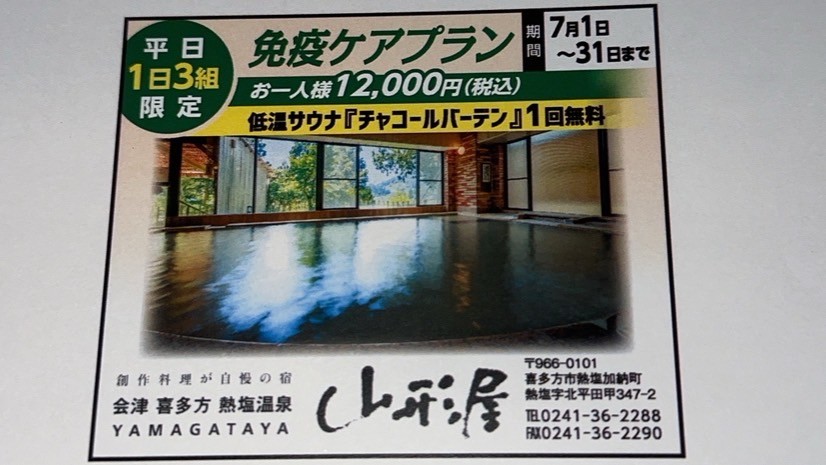 7月はお得なプランをご用意いたしました\(^o^)/ 1泊2食付きでお一人様12,000円の税込みとなります!! さらに、当館自慢の木竹炭低温サウナ「チャコールバーデン」1回無料!! 7月平日、先着3組限定となりますので、ご予約はお早めに!! 地産地消にこだわった創作和食膳で免疫力をアップしましょう\(^o^)/ 熱塩温泉山形屋 0241-36-2288